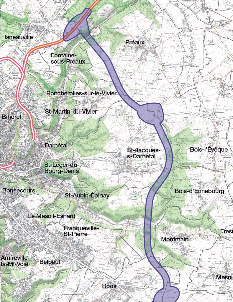 Depuis l’A28 nord, la future autoroute franchit en viaduc la vallée du Robec puis traverse les secteurs agricoles situés entre Préaux et Roncherolle-sur-le-Vivier.